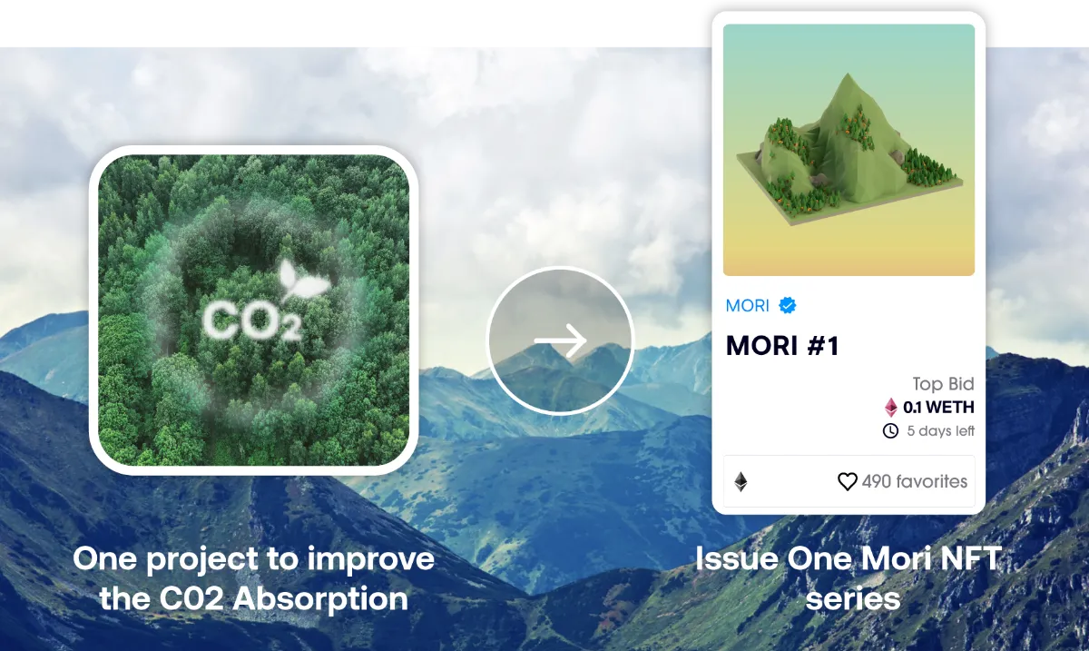 Issue One Mori NFT series is backed up by ONE project to improve forest CO2 absorption through activities such as logging mature trees and planting trees.